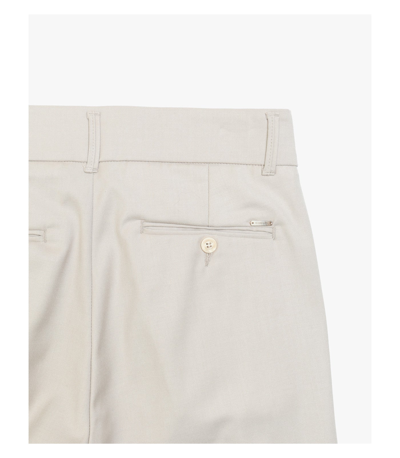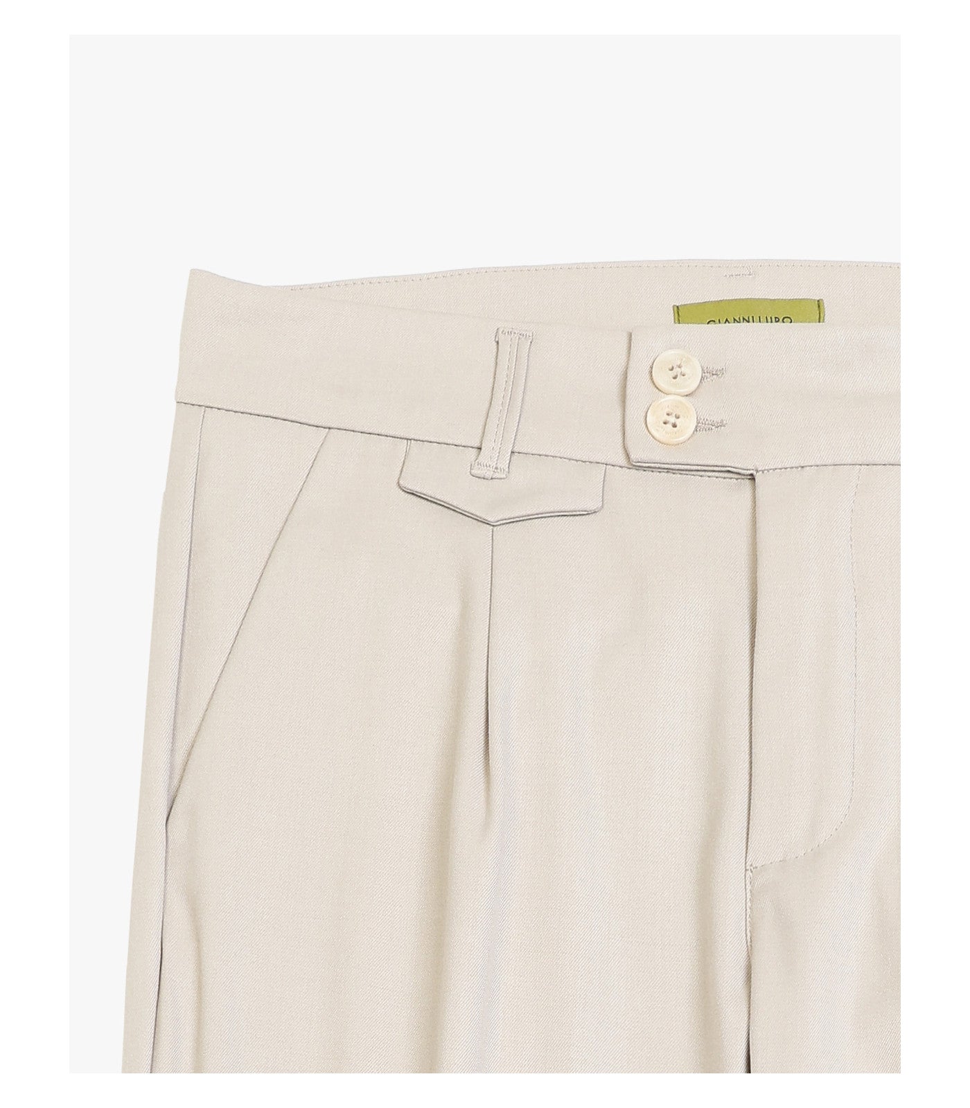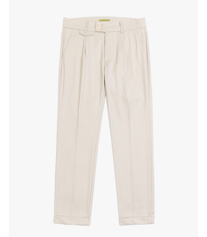 Eleganti e versatili, questi pantaloni presentano una linea morbida con pinces frontali che donano comfort e un tocco sartoriale. Realizzati in un tessuto leggero color sabbia, offrono una vestibilità regolare con gamba dritta e fondo risvoltato. La chiusura è con doppio bottone e zip nascosta, completata da tasche laterali oblique e tasche posteriori a filetto con bottone.